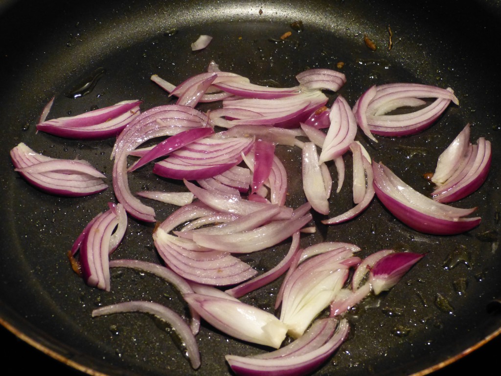 Dans la même sauteuse, faites dorer l’oignon dans le reste d’huile d’olive, à feu moyen.