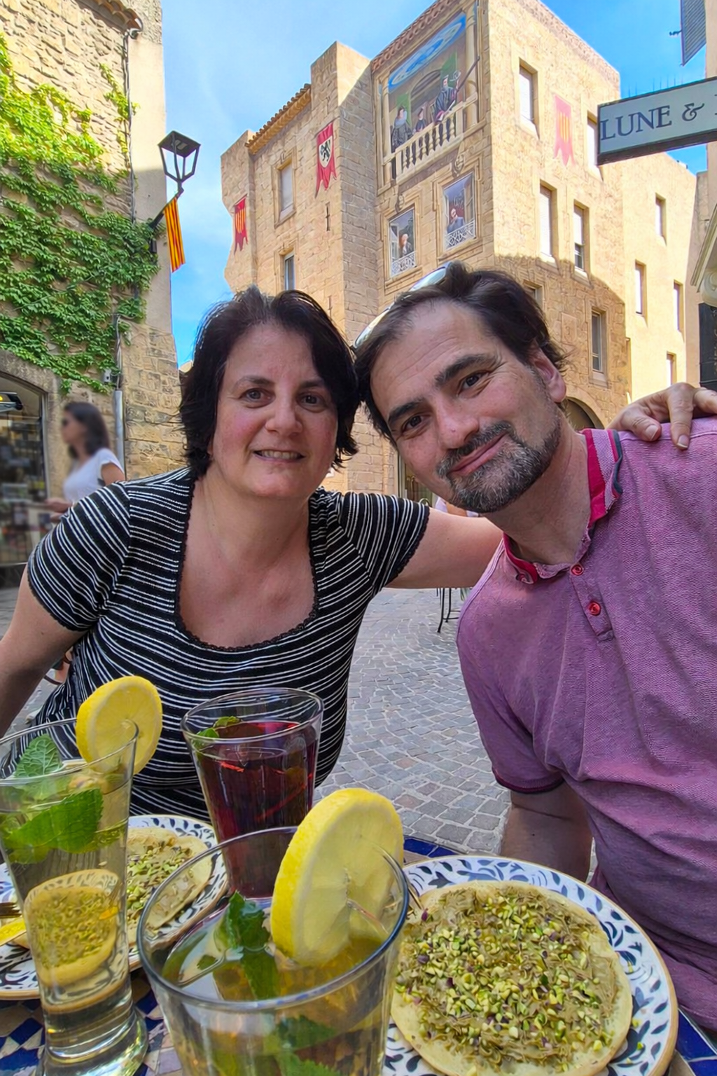 Dès l’arrivée, le regard est attiré par les pâtisseries orientales, véritables petites œuvres d’art. Au-delà de leur esthétique, c’est surtout leur goût qui séduit. Les jeunes ont particulièrement apprécié le makrout aux dattes ainsi que le parfait au citron. De notre côté, avec mon mari chéri Christophe, nous avons succombé aux crêpes aux mille trous à la pistache, généreuses et pleines de saveurs. Les thés et infusions glacés maison viennent parfaire l’expérience, avec des arômes délicats et rafraîchissants.