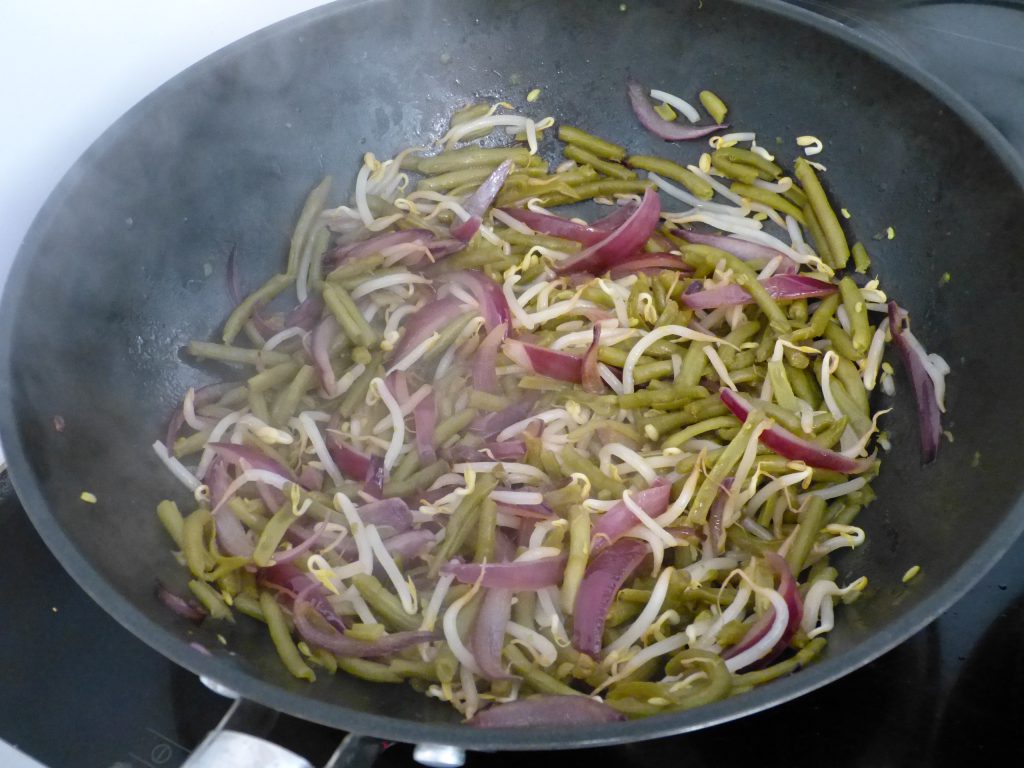 Au bout de ce délai, épluchez et émincez l’oignon rouge. Dans un wok, faites-le revenir, dans une cuillère à soupe d’huile d’olive. Ajoutez-y les germes de soja, la cuillère à soupe de tamari et les haricots verts. Laissez cuire, en remuant de temps en temps, pendant quelques minutes.