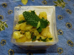 P1040286Commencer par mettre un peu d’eau au fond d’une casserole, puis la vider. Cela permettra de ne pas faire accrocher le lait de coco au fond de cette dernière. Peser votre lait de coco, puis le lait concentré et le porter à ébullition. Pendant ce temps, plonger les feuilles de gélatine dans un grand volume d’eau froide pour les faire ramollir. Lorsque le liquide bout, la verser sur la gélatine bien égouttée. Laisser fondre la gélatine et bien mélanger. Dans un autre bol, peser votre sucre et la cannelle. Ajouter le zeste et le jus de citron. Mélanger et verser le lait par-dessus. Mouler dans les verrines, et réserver au frais. Si vous voulez démouler les panna cotta, il vous suffit de mouiller vos verrines avec de l’eau froide et de les égoutter un peu, avant de mouler la préparation. Il faut par contre attendre au moins 4 heures avant de pouvoir les démouler correctement. Sur votre planche à découper, tailler votre ananas en macédoine, et ciseler la menthe. Les disposer dans un bol et ajouter vos fruits de la passion ainsi que le rhum. Si l’ananas n’est pas assez sucré a votre goût, ajouter un peu de cassonade. Réserver au frais.